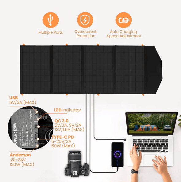 To φορητό Ηλιακό Πάνελ Flex Solar 120W είναι κατασκευασμένο απο μονοκρυσταλικό πυρίτιο, με αποτέλεσμα να παράγει ενέργεια ακόμα και τις μέρες με συννεφιά.