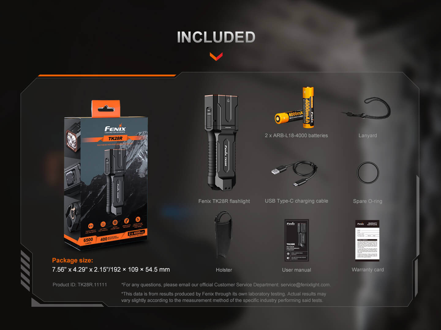 Ο Φακός Fenix TK28Rε τροφοδοτείται με δύο επαναφορτιζόμενες μπαταρίες 4000mAh, ο TK28R λειτουργεί έως και 102 ώρες και επαναφορτίζεται σε λιγότερο από 1,5 ώρα μέσω της θύρας γρήγορης φόρτισης USB-C, η οποία προστατεύεται από ένα συρόμενο κάλυμμα. Ο επίπεδος σχεδιασμός προσφέρει άνετο κράτημα και εντυπωσιακή ισορροπία, δίνοντάς σας πραγματική ισχύ σε μια πολύ συμπαγή μορφή.