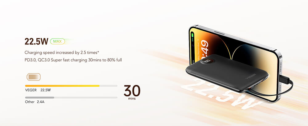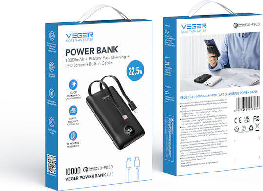 Power Bank Veger C11 10000mAh με Ενσωματωμένα Καλώδια 22.5W