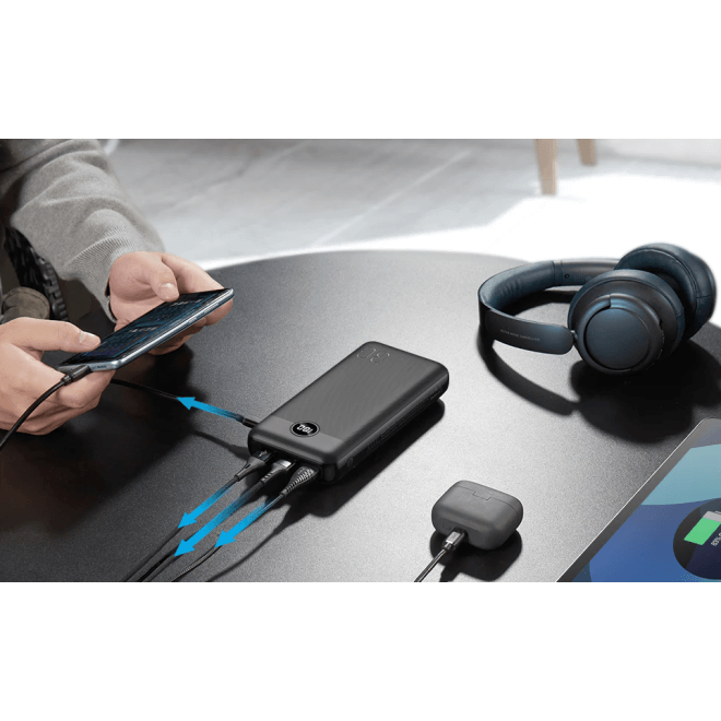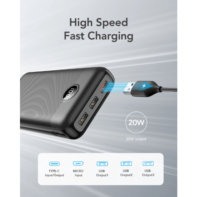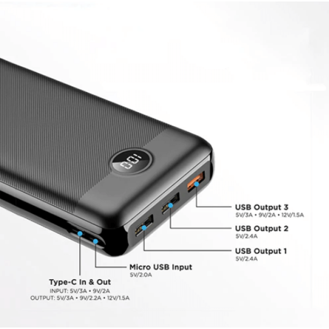 • Το power bank διαθέτει υψηλή χωρητικότητα μπαταρίας και υποστηρίζει τεχνολογία Power Delivery (PD), η οποία επιτρέπει γρήγορη φόρτιση συμβατών συσκευών. Με πολλαπλές θύρες εισόδου και εξόδου, περιλαμβάνοντας τρεις θύρες USB-Α και μία θύρα USB-C εισόδου / εξόδου γρήγορης φόρτισης, το power bank παρέχει ευελιξία και ευκολία στη χρήση. Μπορείτε επίσης να φορτίσετε το power bank μέσω της θύρας Micro USB που διαθέτει.