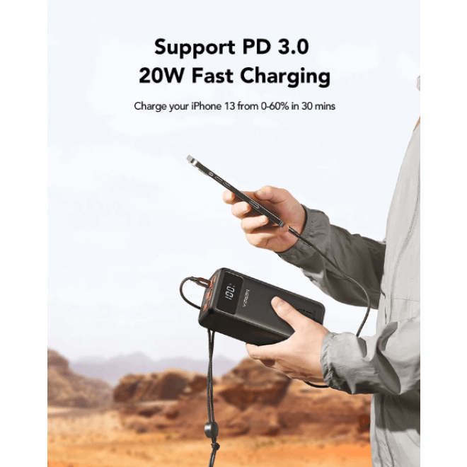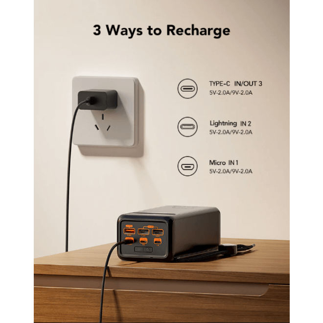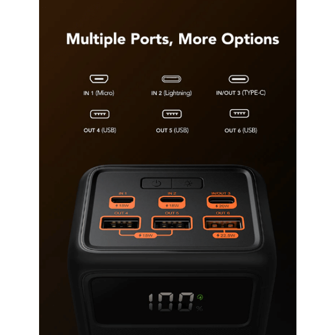 Μπορείτε να επαναφορτίσετε γρήγορα το PowerBank με ισχύ 18W, μέσω των θυρών MicroUSB, Lightning ή Type-C, δίνοντάς σας 3 επιλογές για να το επαναφορτίσετε ανά πάσα στιγμή. Οι 4 έξοδοι μπορούν να φορτίσουν 4 συσκευές ταυτόχρονα, η θύρα Type-C εισόδου και εξόδου, υποστηρίζει QC18W και PD20W, οι θύρες USB-A εξόδου 4 και 5 διαθέτουν PD18W και η θύρα εξόδου 6 USB-A παρέχει μέγιστη ισχύ 22.5W. Είναι δηλαδή εξοπλισμένη με 4 θύρες εξόδου και 3 θύρες εισόδου, η φορητή μπαταρία φόρτισης είναι συμβατή με τα περισσότερα smartphone, tablet, ακουστικά, κάμερες και άλλες συσκευές της αγοράς με την τεράστια χωρητικότητα 50000 mAh. Φορτίστε το iPhone 13 από 0-60% σε 30 λεπτά! Περιλαμβάνει μία ανθεκτική πυξίδα για να διασφαλίσετε ότι περπατάτε προς τη σωστή κατεύθυνση, με ένα ελαφρύ αλλά ανθεκτικό λουράκι για εύκολη μεταφορά κατά την κατασκήνωση, την πεζοπορία και την εξερεύνηση!